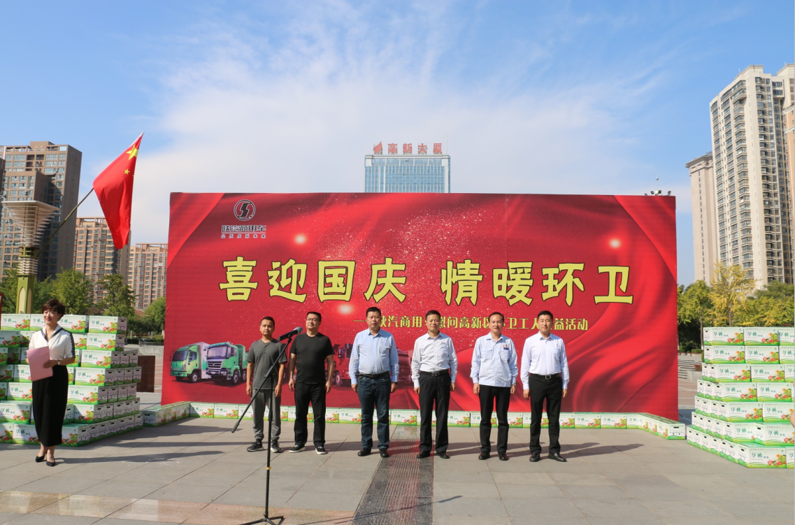 在新中國(guó)成立70周年之際,2019年9月26日下午,陜汽商用車與高新區(qū)管委會(huì)攜手開展“喜迎國(guó)慶 情暖環(huán)衛(wèi)”公益活動(dòng)。高新區(qū)管委會(huì)副主任唐軍科、寶雞寶雞高新區(qū)住房和城鄉(xiāng)建設(shè)局王濤、陜汽商用車黨委副書記史建友、陜汽商用車黨群工作部部長(zhǎng)王建紅、陜汽商用車銷售公司總經(jīng)理劉學(xué)利及高新總公司相關(guān)領(lǐng)導(dǎo)參加。